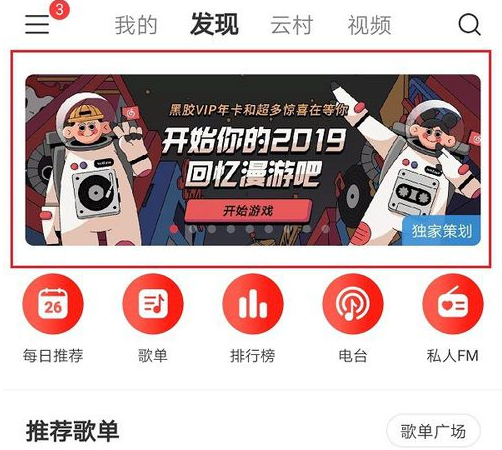 2、然后我们在发现界面,找到网易云音乐2019回忆漫游。