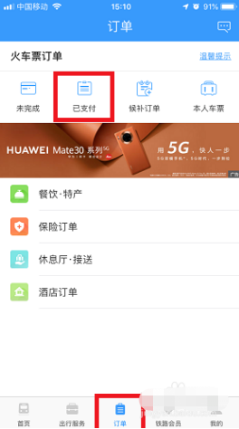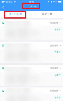 3、然后在已支付页面上找到我们未出行的订单。