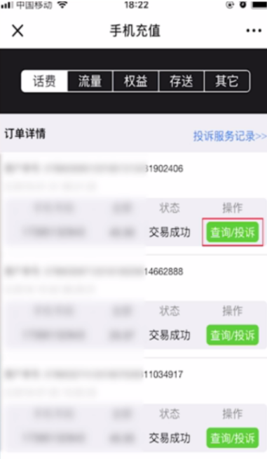 3、然后找到充错的订单,点击“查询/投诉”,点击“我要投诉”。
