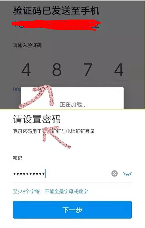输入手机号,点击”继续“,输入”短信验证码“,设置”新密码“,点击”同意“,填写”基本信息“,点击”进入钉钉“