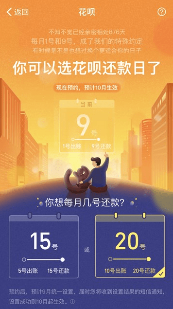 4、然后我们主要有两种选择哦!一种是在15号还款,一种是在20号还款,这两种选择可以根据我们的工资发放日期来定的,但是只有开通花呗满一年的用户才能使用哦。