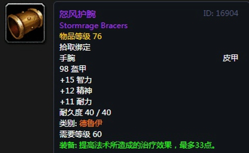 怒风护腕:护腕,出自黑翼之巢副本狂野的拉佐格尔掉落,推荐附魔治疗能力。