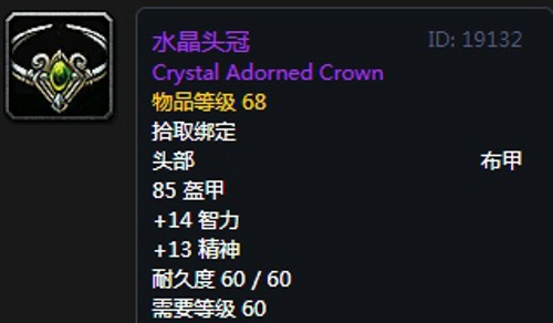 水晶头冠:头部,出自艾萨拉世界BOSS艾索雷葛斯掉落,推荐附魔专注秘药。