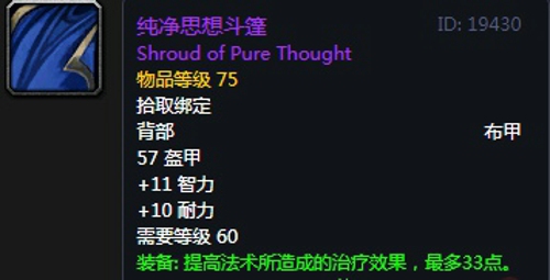 纯净思想斗篷:披风,出自黑翼之巢副本弗莱格瑞掉落,推荐附魔强效抗性。