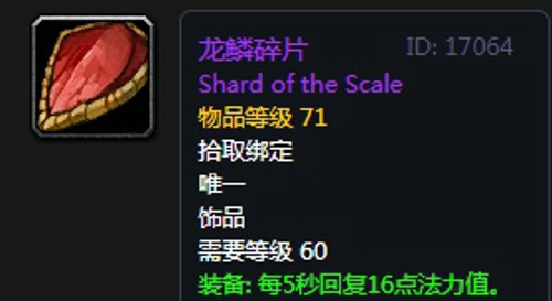 龙鳞碎片:饰品2,出自奥妮克希亚掉落,无法附魔。