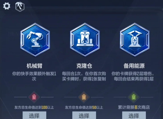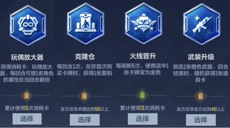 选择比较简单且通用的,比方说每回合1次,在购买卡牌时获得1张复制的“克隆仓”、每刷新5次,就使得商店中1张卡牌变成金色的“火线晋升”、挑选1张橙色武器,回合结束时随机获得1张道具卡的“武装升级”、每回合能使得一名角色的属性在当回合翻倍的“玩偶放大器”等,这些条件都不难很适合去选,最后还需要注意,选择择升级效果是有时间限制的,如果超过了时间还没有做出抉择,那么系统将会自动帮助大家去选择一个,这个选择很有可能会对我们没太大作用,所以大家一定要看好时间,避免时间出现了超过的情况。