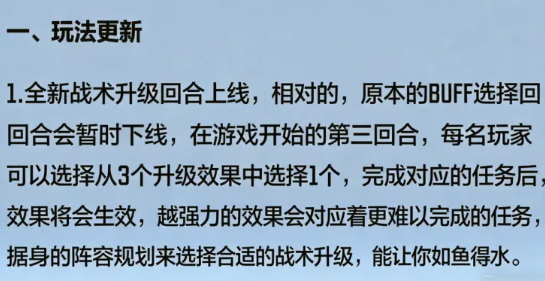 简单来讲,它是本赛季替代了传统buff选择回合的一个新机制,在开局第3回合系统将提供3个不同升级效果选项,和以往直接生效的buff不同,这些升级的效果需要大家去完成对应的任务才可以激活,选择的效果越是强,也就对应着难度更高的任务,意味不再是简单去选择一个buff,而是对阵营的规划、局势判断的综合考验,大家需要同时去根据阵营情况,以及对任务完成判断,去拿最为适合自己的效果。