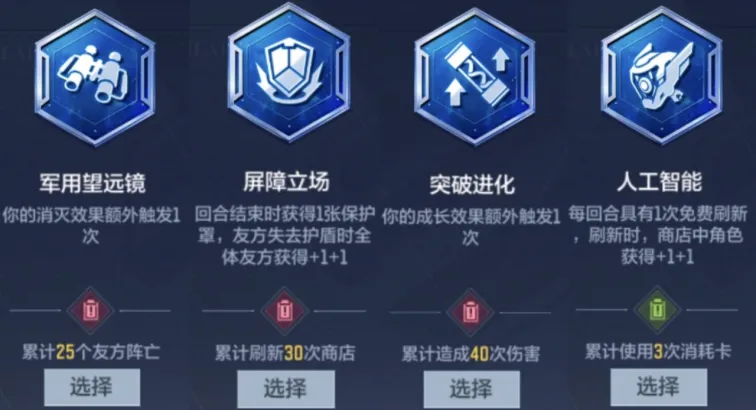 另外还有非常多的升级效果,比如说“望远镜”,可以令消灭效果额外再触发一次,堪称是消灭流的核心助推器,能瞬间提升收割效率,突破进化能让成长效果额外触发一次,是成长流的专属,助力队伍实现伤害生命迅速增加,屏障立场能在回合结束之际获得1个保护罩,友方护盾失去的时候还能让全体获得属性加成,续航与增益都是护盾流的坚固后盾,人工智能可以让每回合都有一次免费进行刷新的机会,并为角色提供属性加成,可以说是百搭的神技,适配成长、快手这些不同流派,大家需要补强度就可以去选它。